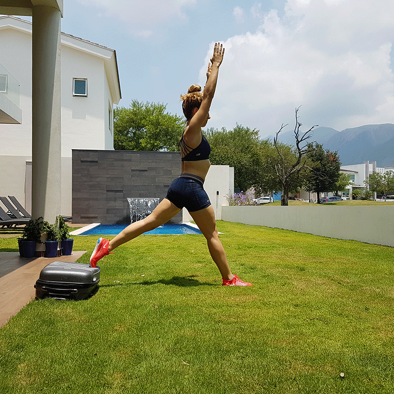 Posición A: Extiende tu pierna derecha hacía atrás, coloca la punta de tu pie sobre la maleta y lleva tus brazos hacía el cielo bien extendidos.